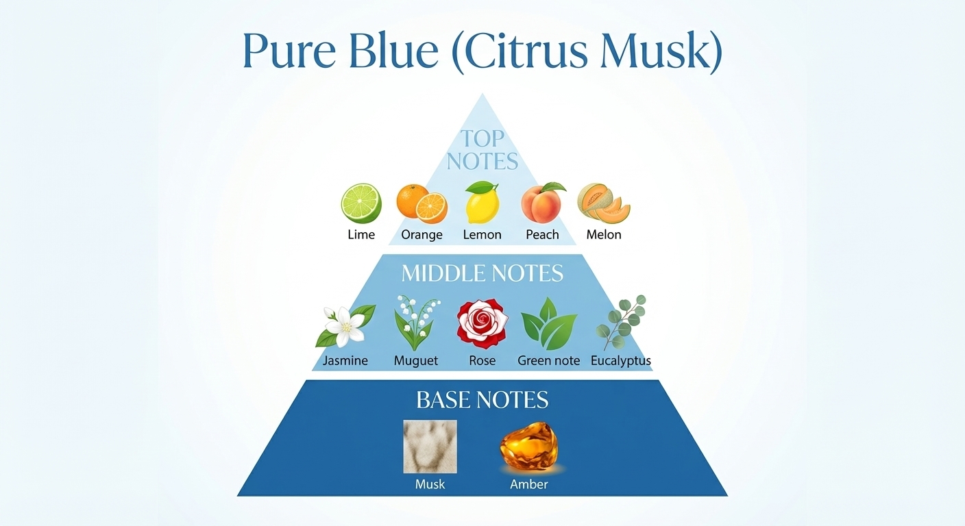 Цитрусово-мускусный аромат, в котором свежесть эвкалипта гармонично сочетается с насыщенной и ароматной нотой ландыша (мюгета), постепенно раскрываясь на коже.
