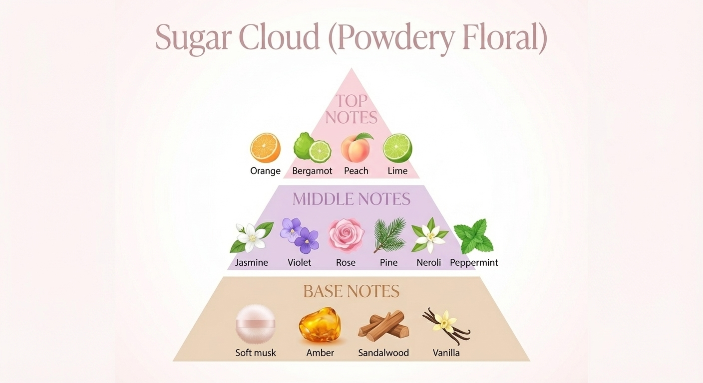 Пудрово-флоральный аромат, в котором пышные ноты жасмина и розы элегантно переплетаются с мягкой сладостью ванили, создавая нежное и утончённое звучание.