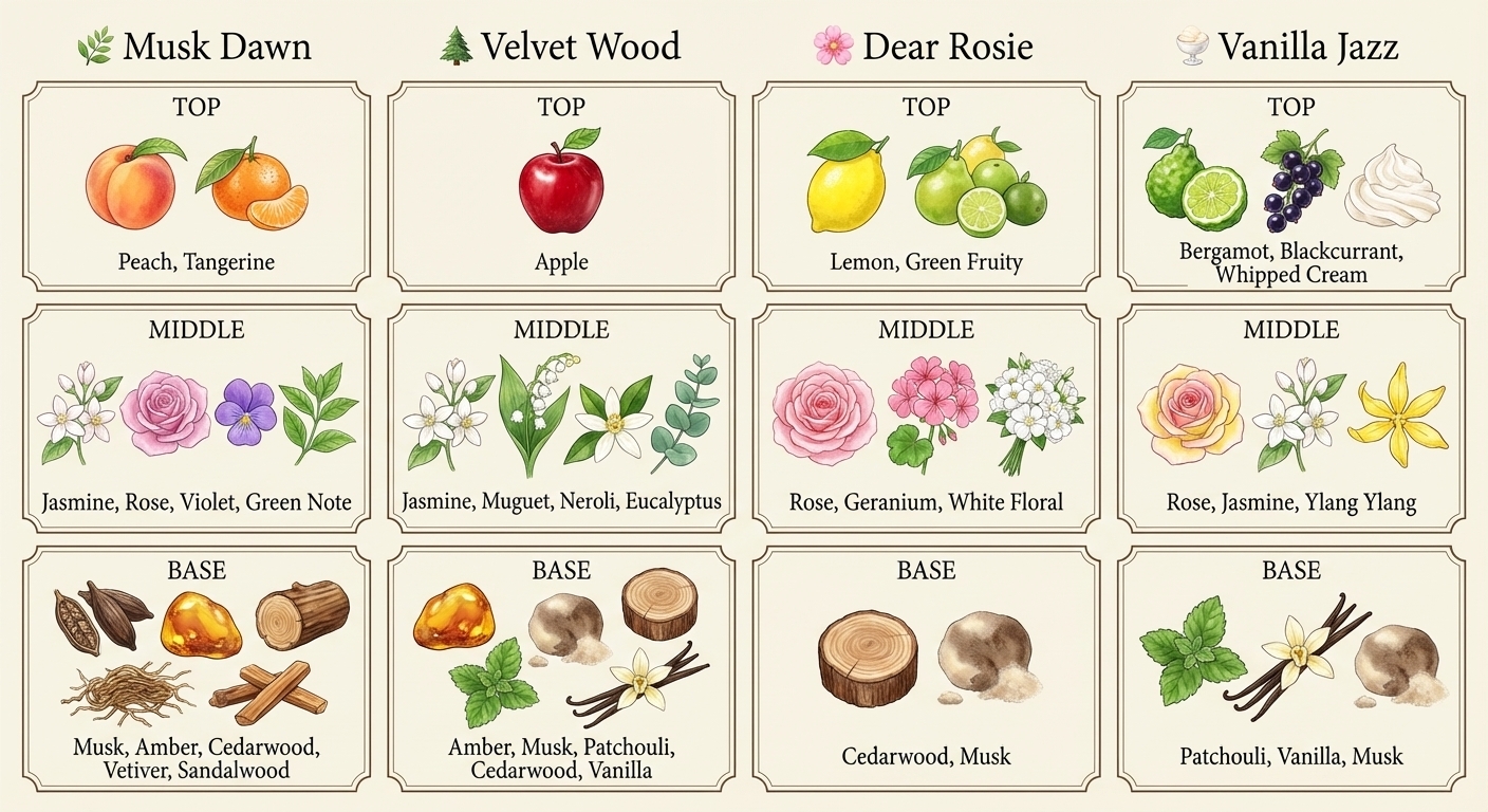 Musk Dawn - Теплый зелёно-цитрусовый аромат, в котором мягко раскрывается нежная роза, переплетённая с глубокими и благородными древесными нотами.